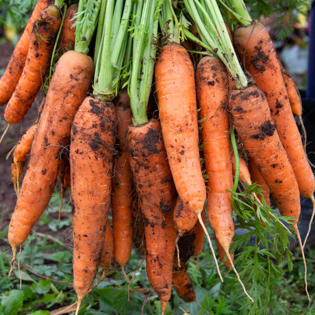 Sow carrots to avoid the very hot part of the year but also frosty periods. Sow either spring or autumn, in very mild areas all year round is possible. A sunny position is required. Carrots need a friable, well drained soil and appreciate mulching. Sow directly where they are to grow, 10 mm deep, 2-3 cm apart in rows 30 cm apart. Germination is slow, preventing the soil from drying out is important for success, covering seed rows with shadecloth or cardboard can help. Thin out to 5 cm apart. Avoid fresh animal manures as they can cause forking. Never try to transplant carrots as the roots will fork in all directions!