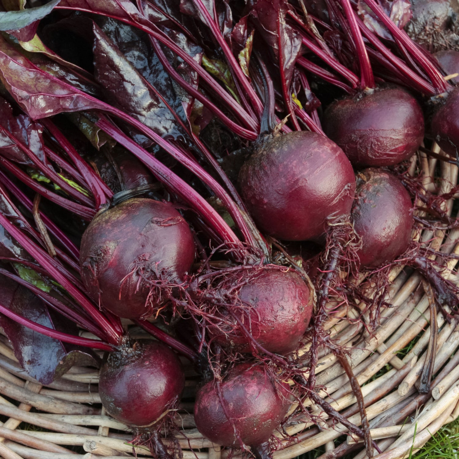 Heirloom beetroot with very attractive deep reddish-purple metallic leaves; the beets are dark red with pretty pink rings inside. They are good especially harvested as baby beets. The young leaves are delicious, excellent as a microgreen and in salad mix.