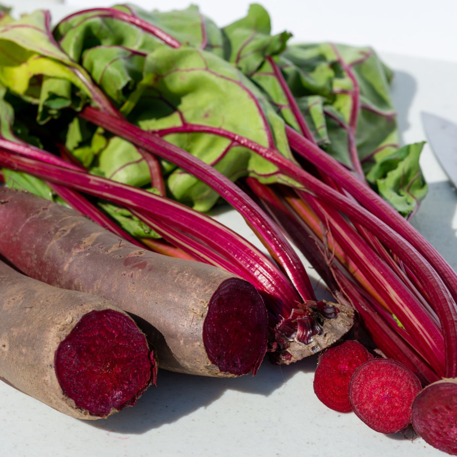 Syn. Cylindra; by far the easiest beetroot to peel and slice. An heirloom variety with a long, deep, dark red, cylindrical root that retains sweetness even when mature. It grows to 15 - 20cm in length and up to 5cm wide. Tops are delicious steamed.