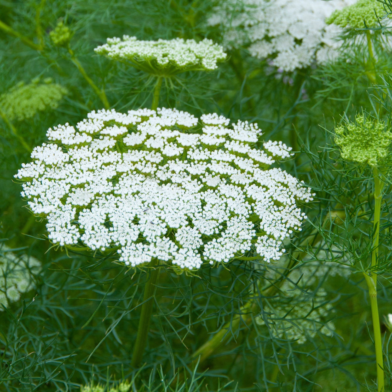 Syn. Green Mist, Khella, Bishop's weed. Queen Anne's Lace is a hardy, vigorous, tall annual with clusters of greenish-white lacy flowers 10-15 cm in dia.; it is commonly grown as a cut flower. The leaves are edible, with a flavour similar to cress. A very useful flowering plant as it attracts beneficial insects including lacewings, assassin bugs and predatory wasps; it can also be planted as part of an orchard understorey. Khella seeds were used medicinally in ancient Egypt.