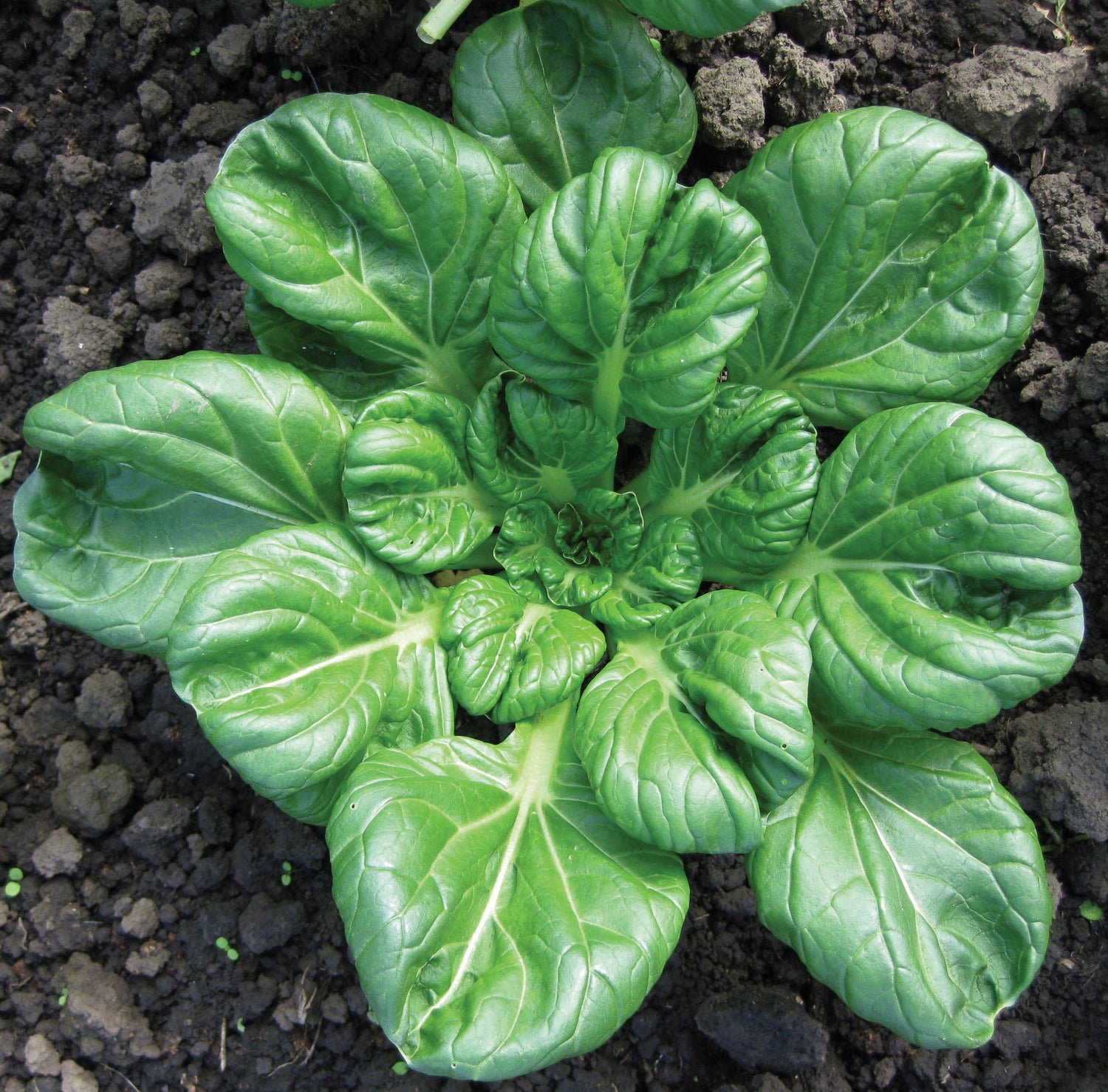 Syn. Chinese flat cabbage. A traditional Chinese vegetable that forms a flat, compact rosette. The leaves are dark green, glossy and spoon-shaped. It has a mild taste, a long harvest period and can be cut a few leaves at a time. It is used in the same way as spinach or cabbage. The very young leaves can be eaten in salad. It is heat and cold tolerant and slow to bolt. The flowers are attractive to beneficial insects.